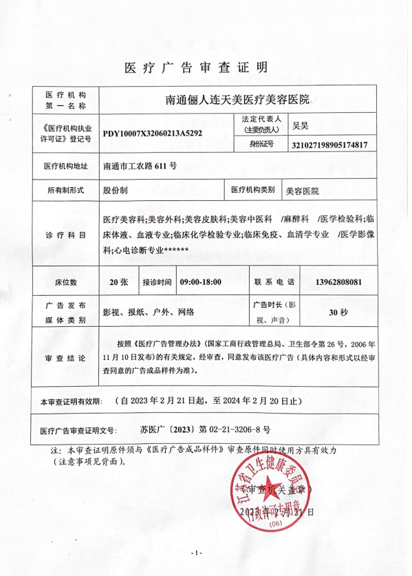 南通儷人連天美醫療美容醫院是與著名的醫療美容集團合作建立的醫院,醫院提供高品質的醫療美容服務。2008年,南通儷人連天美醫療美容醫院落戶南通,成為由南通衛生局審批的專業醫療美容醫院。南通儷人連天美醫療美容醫院,特別設有專業的整形美容科、皮膚美容科和微創美容科三大科室,致力于為廣大求美者提供全方位的醫療美容服務。南通儷人連天美醫療美容醫院為求美者建立個人終生美麗檔案,一對一進行細致服務。 11年來,南通儷人連天美醫療美容醫院,不斷引進先進設備,不斷完善醫美技術,一批優秀、專業而穩定的醫生團隊,為無數求美者鑄就美麗夢想。